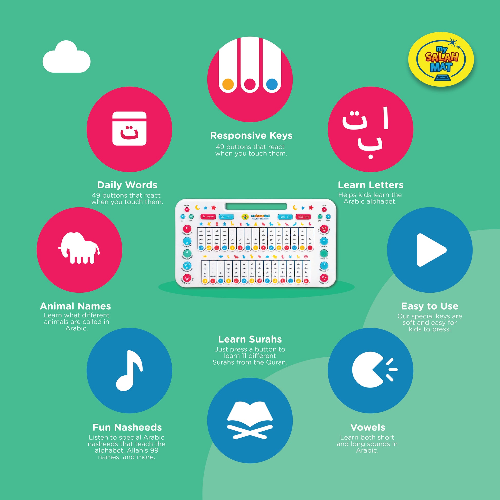 Meet My Quran Pad! This Islamic learning tool is designed to teach children the Arabic Alphabet. Each key, when pressed, recites a letter, making learning interactive and fun. But that's not all – My Quran Pad also teaches kids animal names in Arabic, beginner words, introductory Surahs, and lovely Nasheeds. It's more than an educational device, it's a journey into the heart of the Quran and Arabic language.